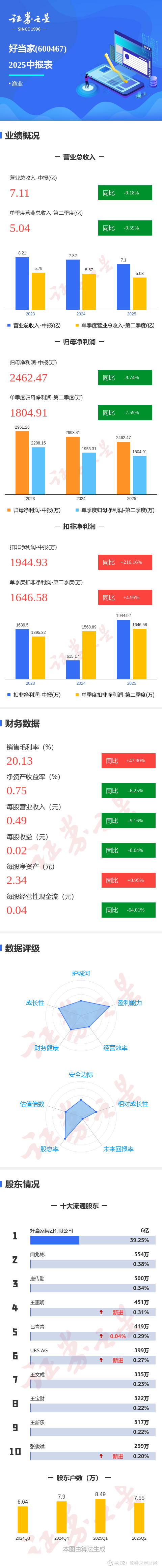 证券之星消息,好当家2025年中报显示,公司主营收入7.11亿元,同比下降9.18%;归母净利润2462.47万元,同比下降8.74%;扣非净利润1944.93万元,同比上升216.16%;其中2025年第二季度,公司单季度主营收入5.04亿元,同比下降9.6%;单季度归母净利润1804.91万元,同比下降7.6%;单季度扣非净利润1646.58万元,同比上升4.95%;负债率51.43%,投资收益943.35万元,财务费用7612.56万元,毛利率20.13%。