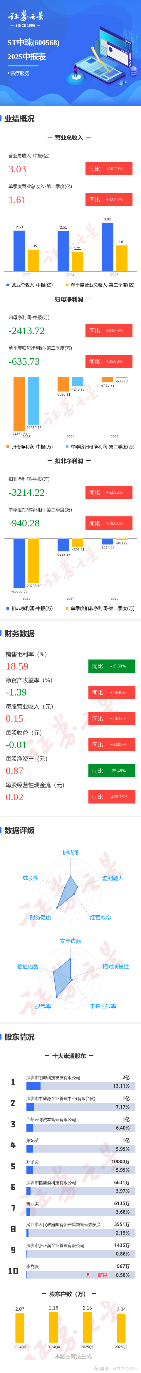 证券之星消息,ST中珠2025年中报显示,公司主营收入3.03亿元,同比上升20.29%;归母净利润-2413.72万元,同比上升63.04%;扣非净利润-3214.22万元,同比上升52.93%;其中2025年第二季度,公司单季度主营收入1.61亿元,同比上升32.54%;单季度归母净利润-635.73万元,同比上升85.01%;单季度扣非净利润-940.28万元,同比上升78.61%;负债率17.16%,财务费用-164.94万元,毛利率18.59%。