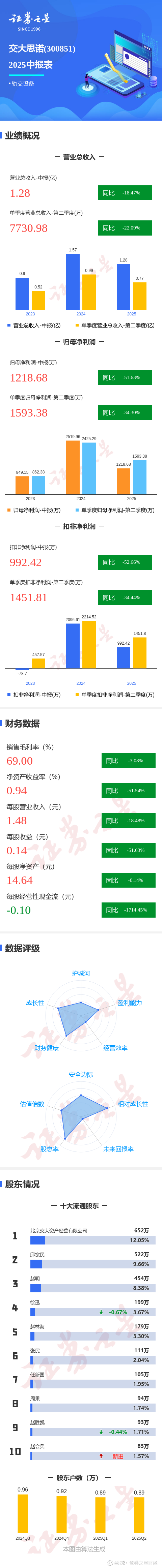 证券之星消息,交大思诺2025年中报显示,公司主营收入1.28亿元,同比下降18.48%;归母净利润1218.68万元,同比下降51.64%;扣非净利润992.42万元,同比下降52.67%;其中2025年第二季度,公司单季度主营收入7730.98万元,同比下降22.09%;单季度归母净利润1593.38万元,同比下降34.3%;单季度扣非净利润1451.81万元,同比下降34.44%;负债率10.25%,投资收益837.48万元,财务费用-38.71万元,毛利率69.0%。