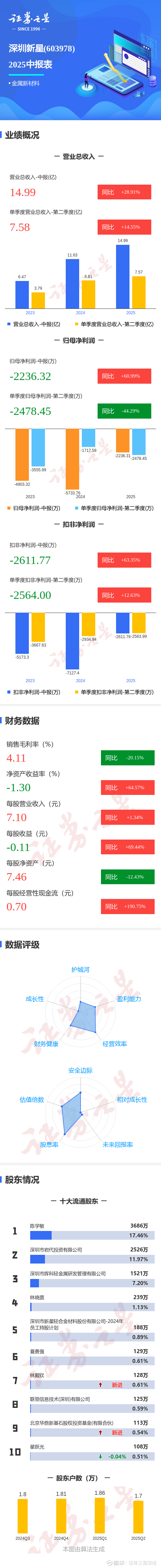 证券之星消息,深圳新星2025年中报显示,公司主营收入14.99亿元,同比上升28.91%;归母净利润-2236.32万元,同比上升61.0%;扣非净利润-2611.77万元,同比上升63.36%;其中2025年第二季度,公司单季度主营收入7.58亿元,同比上升14.56%;单季度归母净利润-2478.45万元,同比下降44.3%;单季度扣非净利润-2564.0万元,同比上升12.64%;负债率61.03%,投资收益-283.53万元,财务费用2758.25万元,毛利率4.11%。