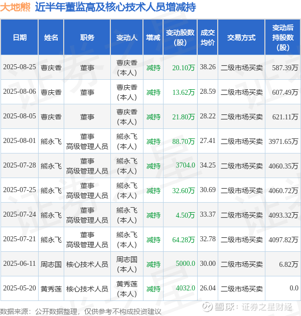 大地熊近半年内的董监高及核心技术人员增减持详情如下: