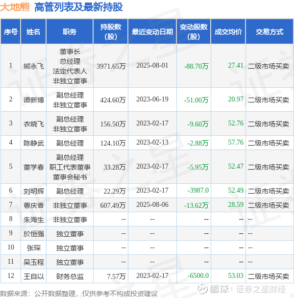 大地熊的高管列表及最新持股情况如下: