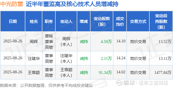 中光防雷近半年内的董监高及核心技术人员增减持详情如下: