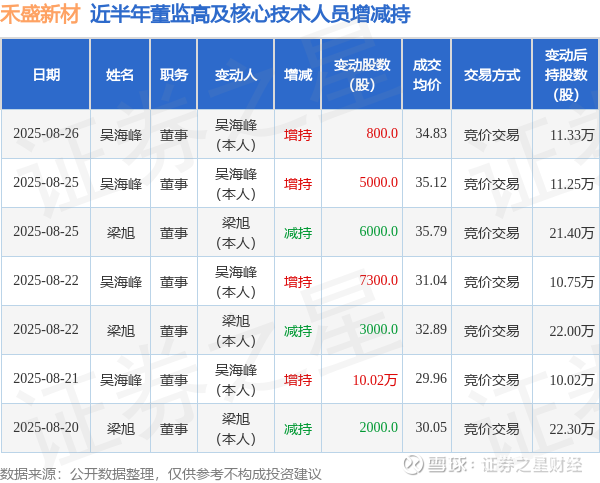 禾盛新材近半年内的董监高及核心技术人员增减持详情如下: