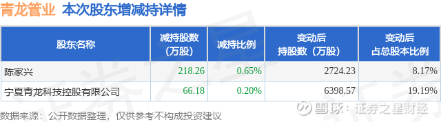 证券之星消息,8月27日青龙管业发布公告《青龙管业:关于控股股东、实际控制人减持股份触及1%整数倍的公告》,其股东陈家兴、宁夏青龙科技控股有限公司于2025年7月29日至2025年8月26日间合计减持284.44万股,占公司目前总股本的0.8529%,变动期间该股股价下跌3.26%,截止8月26日收盘报12.17元。