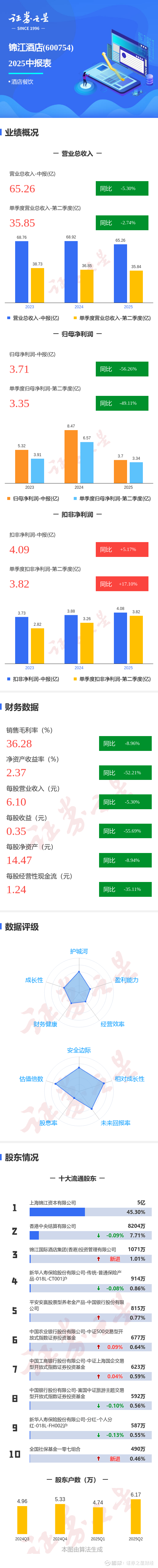 证券之星消息,锦江酒店2025年中报显示,公司主营收入65.26亿元,同比下降5.31%;归母净利润3.71亿元,同比下降56.27%;扣非净利润4.09亿元,同比上升5.17%;其中2025年第二季度,公司单季度主营收入35.85亿元,同比下降2.74%;单季度归母净利润3.35亿元,同比下降49.12%;单季度扣非净利润3.82亿元,同比上升17.11%;负债率65.43%,投资收益1.68亿元,财务费用3.3亿元,毛利率36.28%。