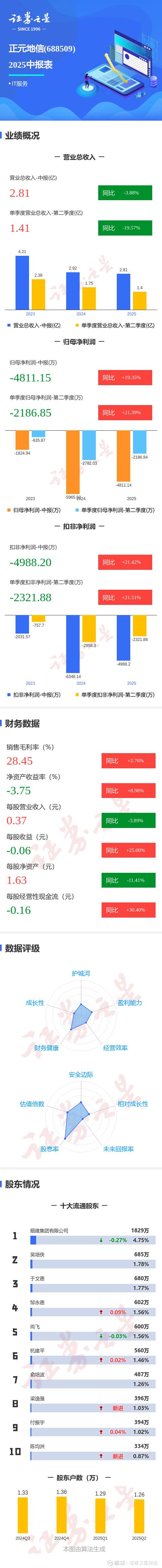 证券之星消息,正元地信2025年中报显示,公司主营收入2.81亿元,同比下降3.88%;归母净利润-4811.15万元,同比上升19.35%;扣非净利润-4988.2万元,同比上升21.42%;其中2025年第二季度,公司单季度主营收入1.41亿元,同比下降19.57%;单季度归母净利润-2186.85万元,同比上升21.39%;单季度扣非净利润-2321.88万元,同比上升21.51%;负债率58.73%,投资收益-9.74万元,财务费用370.26万元,毛利率28.45%。