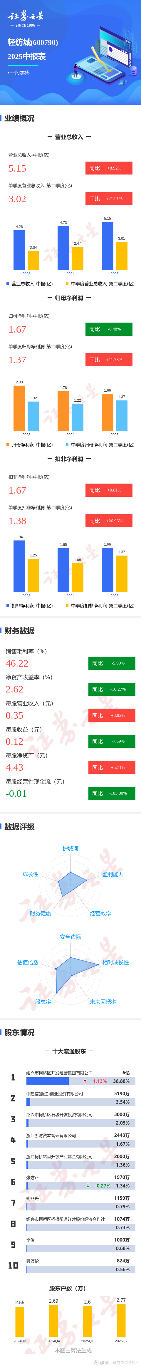 证券之星消息,轻纺城2025年中报显示,公司主营收入5.15亿元,同比上升8.93%;归母净利润1.67亿元,同比下降6.49%;扣非净利润1.67亿元,同比上升0.82%;其中2025年第二季度,公司单季度主营收入3.02亿元,同比上升21.92%;单季度归母净利润1.37亿元,同比上升11.79%;单季度扣非净利润1.38亿元,同比上升26.96%;负债率45.47%,投资收益1.14亿元,财务费用2703.3万元,毛利率46.22%。