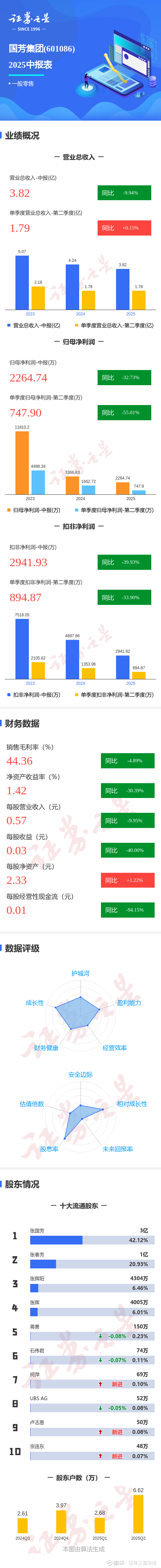 证券之星消息,国芳集团2025年中报显示,公司主营收入3.82亿元,同比下降9.95%;归母净利润2264.74万元,同比下降32.73%;扣非净利润2941.93万元,同比下降39.93%;其中2025年第二季度,公司单季度主营收入1.79亿元,同比上升0.16%;单季度归母净利润747.9万元,同比下降55.02%;单季度扣非净利润894.87万元,同比下降33.91%;负债率42.72%,投资收益1052.99万元,财务费用26.16万元,毛利率44.36%。