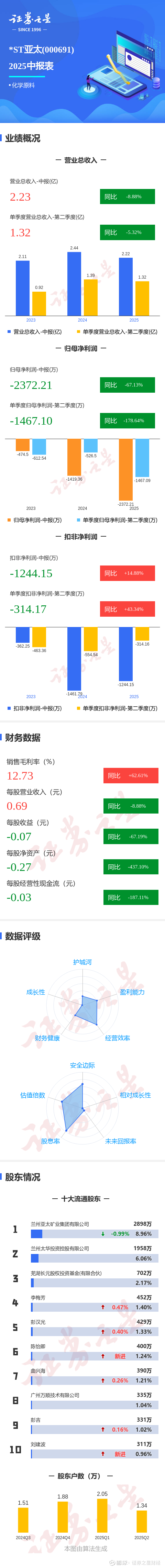 证券之星消息,*ST亚太2025年中报显示,公司主营收入2.23亿元,同比下降8.88%;归母净利润-2372.21万元,同比下降67.13%;扣非净利润-1244.15万元,同比上升14.89%;其中2025年第二季度,公司单季度主营收入1.32亿元,同比下降5.33%;单季度归母净利润-1467.1万元,同比下降178.65%;单季度扣非净利润-314.17万元,同比上升43.35%;负债率93.1%,投资收益0.78万元,财务费用738.0万元,毛利率12.73%。