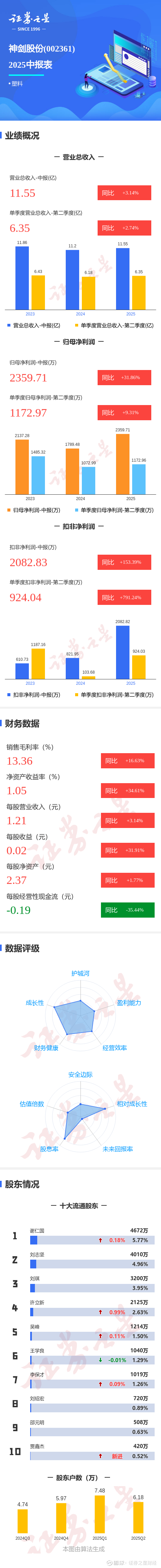 证券之星消息,神剑股份2025年中报显示,公司主营收入11.55亿元,同比上升3.14%;归母净利润2359.71万元,同比上升31.87%;扣非净利润2082.83万元,同比上升153.4%;其中2025年第二季度,公司单季度主营收入6.35亿元,同比上升2.75%;单季度归母净利润1172.97万元,同比上升9.32%;单季度扣非净利润924.04万元,同比上升791.24%;负债率50.36%,投资收益168.21万元,财务费用552.75万元,毛利率13.36%。