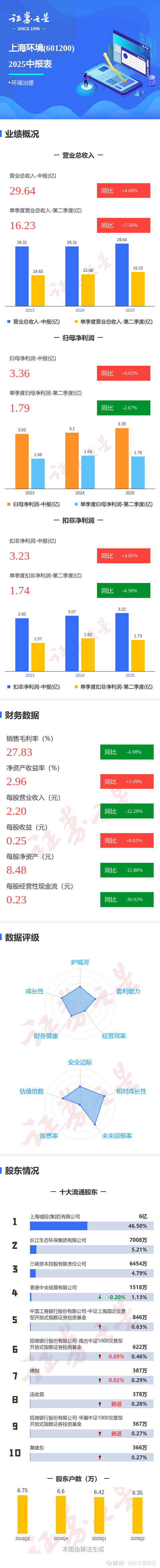 证券之星消息,上海环境2025年中报显示,公司主营收入29.64亿元,同比上升4.68%;归母净利润3.36亿元,同比上升8.02%;扣非净利润3.23亿元,同比上升4.85%;其中2025年第二季度,公司单季度主营收入16.23亿元,同比上升7.57%;单季度归母净利润1.79亿元,同比下降2.68%;单季度扣非净利润1.74亿元,同比下降4.58%;负债率55.69%,投资收益927.78万元,财务费用1.27亿元,毛利率27.83%。