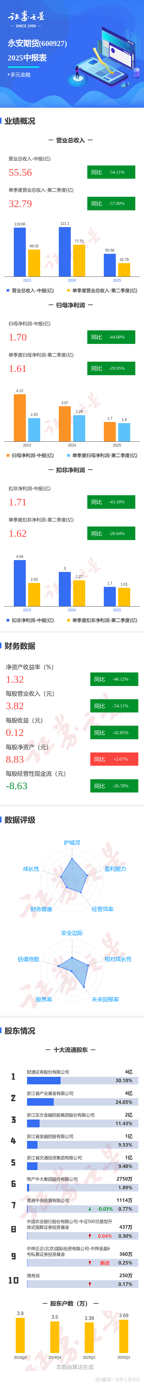 证券之星消息,永安期货2025年中报显示,公司主营收入55.56亿元,同比下降54.12%;归母净利润1.7亿元,同比下降44.69%;扣非净利润1.71亿元,同比下降43.18%;其中2025年第二季度,公司单季度主营收入32.79亿元,同比下降57.81%;单季度归母净利润1.61亿元,同比下降29.96%;单季度扣非净利润1.62亿元,同比下降28.84%;负债率79.4%,投资收益2.64亿元。