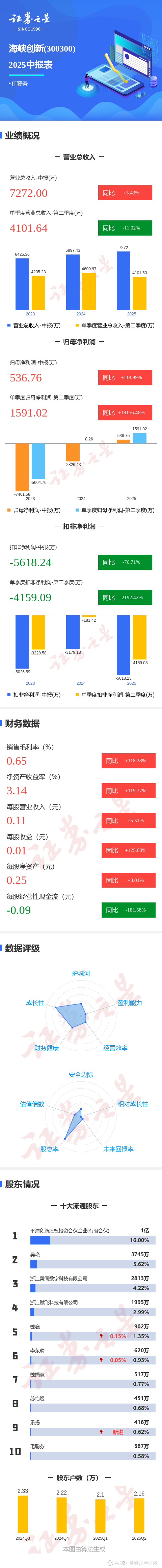 证券之星消息,海峡创新2025年中报显示,公司主营收入7272.0万元,同比上升5.43%;归母净利润536.76万元,同比上升118.99%;扣非净利润-5618.24万元,同比下降76.72%;其中2025年第二季度,公司单季度主营收入4101.64万元,同比下降11.03%;单季度归母净利润1591.02万元,同比上升19156.46%;单季度扣非净利润-4159.09万元,同比下降2192.43%;负债率83.86%,投资收益7971.33万元,财务费用2443.88万元,毛利率0.65%。