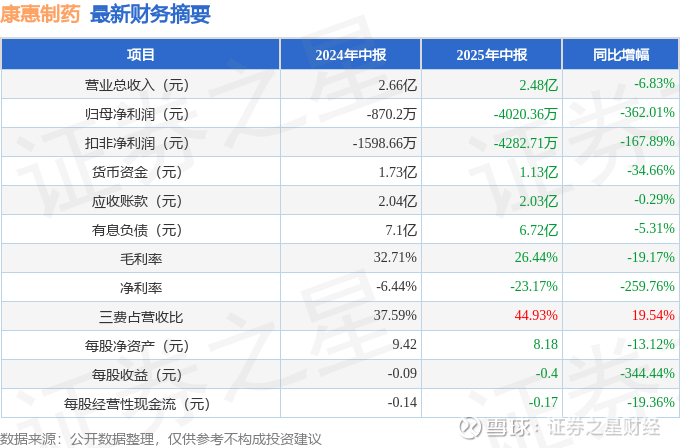 据证券之星公开数据整理,近期康惠制药(603139)发布2025年中报。截至本报告期末,公司营业总收入2.48亿元,同比下降6.83%,归母净利润-4020.36万元,同比下降362.01%。按单季度数据看,第二季度营业总收入1.26亿元,同比下降8.76%,第二季度归母净利润-2296.43万元,同比下降134.61%。本报告期康惠制药短期债务压力上升,流动比率达0.96。
