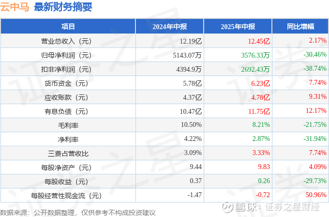 据证券之星公开数据整理,近期云中马(603130)发布2025年中报。截至本报告期末,公司营业总收入12.45亿元,同比上升2.17%,归母净利润3576.33万元,同比下降30.46%。按单季度数据看,第二季度营业总收入6.59亿元,同比下降1.81%,第二季度归母净利润2541.44万元,同比下降6.95%。本报告期云中马公司应收账款体量较大,当期应收账款占最新年报归母净利润比达475.86%。