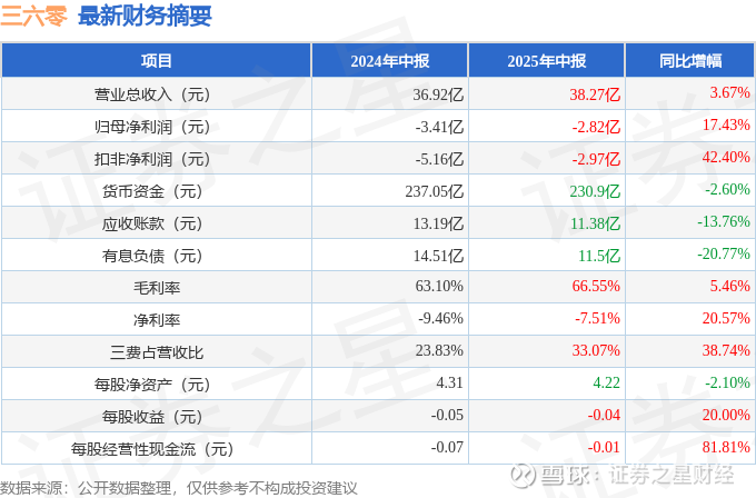 据证券之星公开数据整理,近期三六零(601360)发布2025年中报。截至本报告期末,公司营业总收入38.27亿元,同比上升3.67%,归母净利润-2.82亿元,同比上升17.43%。按单季度数据看,第二季度营业总收入19.63亿元,同比下降0.45%,第二季度归母净利润-861.6万元,同比上升96.28%。本报告期三六零三费占比上升明显,财务费用、销售费用和管理费用总和占总营收同比增幅达37%。