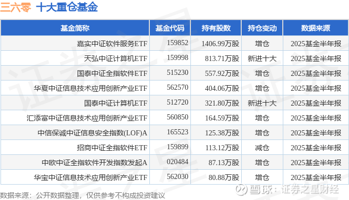持有三六零最多的基金为嘉实中证软件服务ETF,目前规模为31.95亿元,最新净值0.9836(8月27日),较上一交易日下跌0.16%,近一年上涨103.64%。该基金现任基金经理为田光远。
