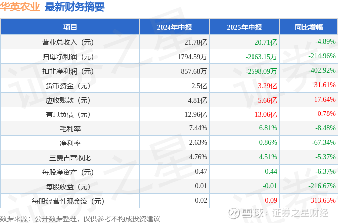 据证券之星公开数据整理,近期华英农业(002321)发布2025年中报。截至本报告期末,公司营业总收入20.71亿元,同比下降4.89%,归母净利润-2063.15万元,同比下降214.96%。按单季度数据看,第二季度营业总收入13.02亿元,同比下降9.36%,第二季度归母净利润-871.28万元,同比下降151.77%。本报告期华英农业公司应收账款体量较大,当期应收账款占最新年报归母净利润比达1750.13%。
