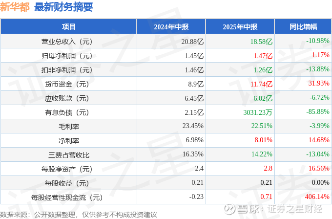 据证券之星公开数据整理,近期新华都(002264)发布2025年中报。截至本报告期末,公司营业总收入18.58亿元,同比下降10.98%,归母净利润1.47亿元,同比上升1.17%。按单季度数据看,第二季度营业总收入7.52亿元,同比上升9.62%,第二季度归母净利润5406.18万元,同比上升4.45%。本报告期新华都公司应收账款体量较大,当期应收账款占最新年报归母净利润比达231.27%。