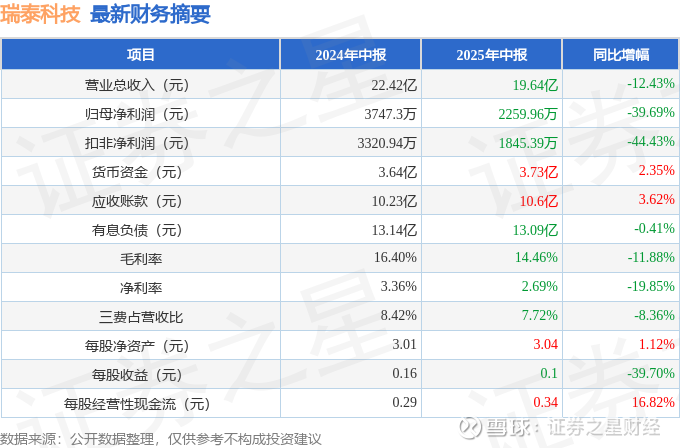 据证券之星公开数据整理,近期瑞泰科技(002066)发布2025年中报。截至本报告期末,公司营业总收入19.64亿元,同比下降12.43%,归母净利润2259.96万元,同比下降39.69%。按单季度数据看,第二季度营业总收入9.83亿元,同比下降11.12%,第二季度归母净利润611.42万元,同比下降59.38%。本报告期瑞泰科技公司应收账款体量较大,当期应收账款占最新年报归母净利润比达1859.4%。