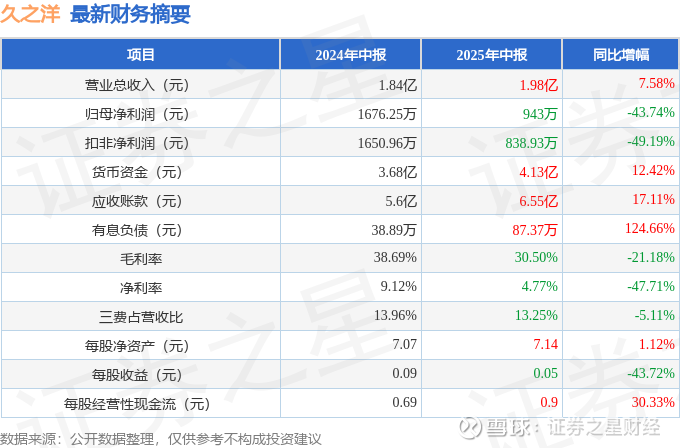 据证券之星公开数据整理,近期久之洋(300516)发布2025年中报。截至本报告期末,公司营业总收入1.98亿元,同比上升7.58%,归母净利润943.0万元,同比下降43.74%。按单季度数据看,第二季度营业总收入1.31亿元,同比上升8.6%,第二季度归母净利润1533.75万元,同比上升22.83%。本报告期久之洋公司应收账款体量较大,当期应收账款占最新年报归母净利润比达2115.78%。