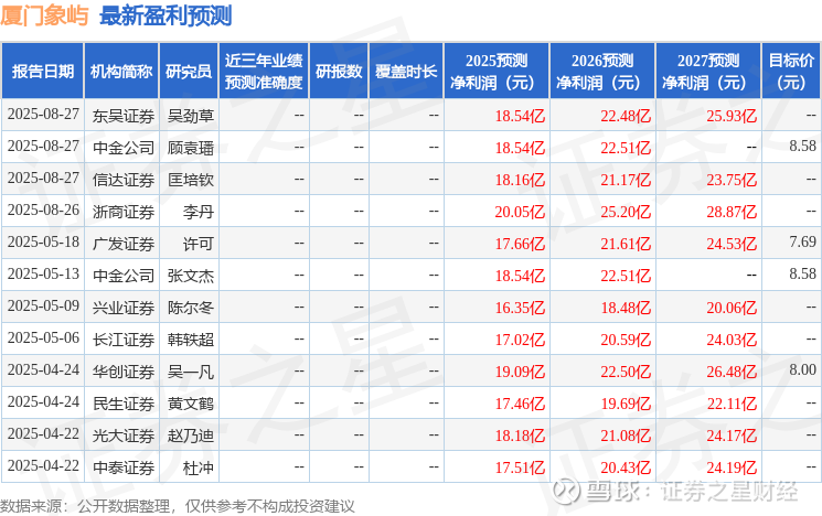 最新盈利预测明细如下: