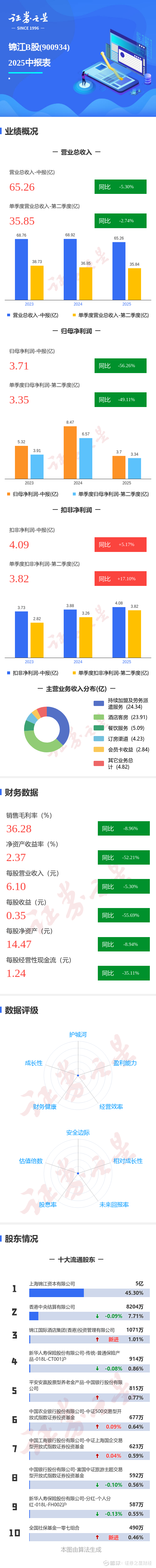 证券之星消息,锦江B股2025年中报显示,公司主营收入65.26亿元,同比下降5.31%;归母净利润3.71亿元,同比下降56.27%;扣非净利润4.09亿元,同比上升5.17%;其中2025年第二季度,公司单季度主营收入35.85亿元,同比下降2.74%;单季度归母净利润3.35亿元,同比下降49.12%;单季度扣非净利润3.82亿元,同比上升17.11%;负债率65.43%,投资收益1.68亿元,财务费用3.3亿元,毛利率36.28%。