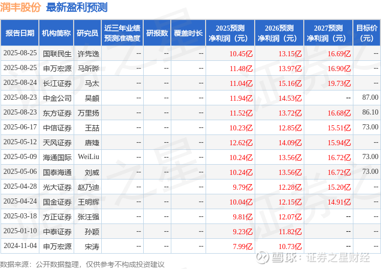 最新盈利预测明细如下: