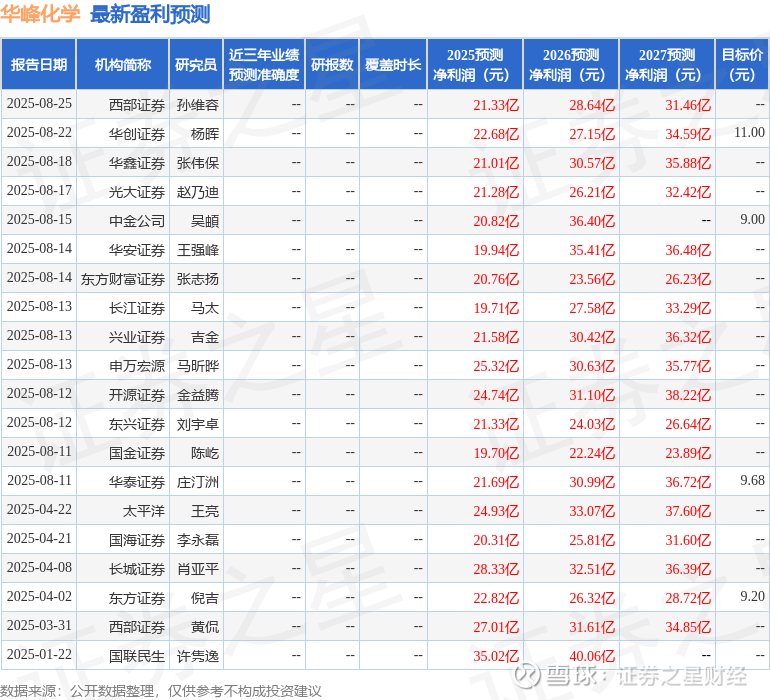 最新盈利预测明细如下: