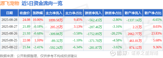 证券之星消息,源飞宠物8月28日涨停收盘,收盘价24.08元。该股于9点30分涨停,11次打开涨停,截止收盘封单资金为365.1万元,占其流通市值0.14%。