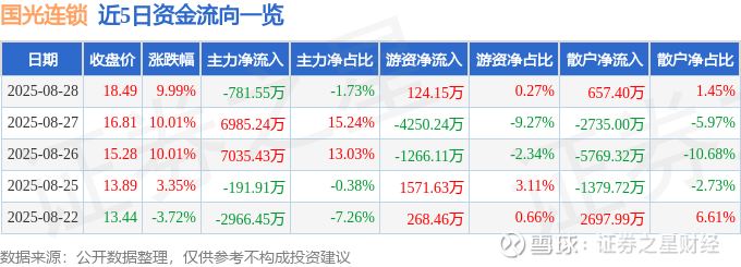 证券之星消息,国光连锁8月28日涨停收盘,收盘价18.49元。该股于9点42分涨停,未打开涨停,截止收盘封单资金为7440.73万元,占其流通市值0.8%。
