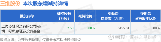 证券之星消息,8月28日三维股份发布公告《三维股份:三维控股集团股份有限公司简式权益变动报告书》,其股东上海赤钥投资有限公司-赤钥10号私募证券投资基金于2025年8月27日合计减持2.59万股,占公司目前总股本的0.0025%,变动期间该股股价下跌7.34%,截止8月27日收盘报11.86元。