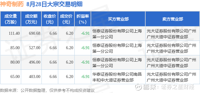 证券之星消息,8月28日神奇制药发生大宗交易,交易数据如下: