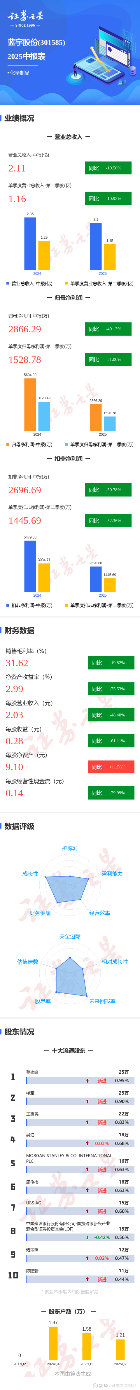 证券之星消息,蓝宇股份2025年中报显示,公司主营收入2.11亿元,同比下降10.57%;归母净利润2866.29万元,同比下降49.13%;扣非净利润2696.69万元,同比下降50.78%;其中2025年第二季度,公司单季度主营收入1.16亿元,同比下降10.93%;单季度归母净利润1528.78万元,同比下降51.01%;单季度扣非净利润1445.69万元,同比下降52.36%;负债率16.41%,投资收益175.8万元,财务费用-75.61万元,毛利率31.62%。