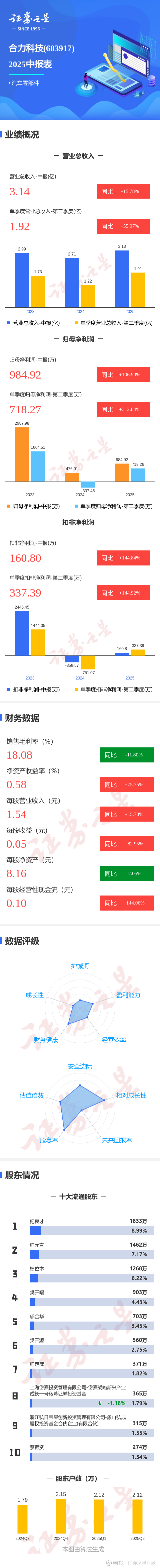 证券之星消息,合力科技2025年中报显示,公司主营收入3.14亿元,同比上升15.79%;归母净利润984.92万元,同比上升106.91%;扣非净利润160.8万元,同比上升144.84%;其中2025年第二季度,公司单季度主营收入1.92亿元,同比上升55.97%;单季度归母净利润718.27万元,同比上升312.85%;单季度扣非净利润337.39万元,同比上升144.92%;负债率17.92%,投资收益45.52万元,财务费用-1003.73万元,毛利率18.08%。