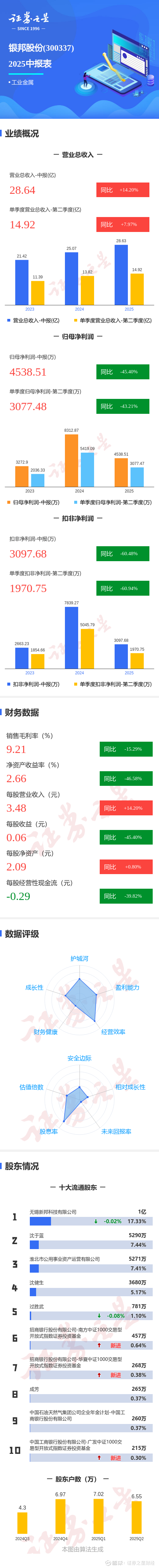 证券之星消息,银邦股份2025年中报显示,公司主营收入28.64亿元,同比上升14.21%;归母净利润4538.51万元,同比下降45.4%;扣非净利润3097.68万元,同比下降60.49%;其中2025年第二季度,公司单季度主营收入14.92亿元,同比上升7.97%;单季度归母净利润3077.48万元,同比下降43.21%;单季度扣非净利润1970.75万元,同比下降60.94%;负债率74.29%,投资收益21.4万元,财务费用7851.57万元,毛利率9.21%。