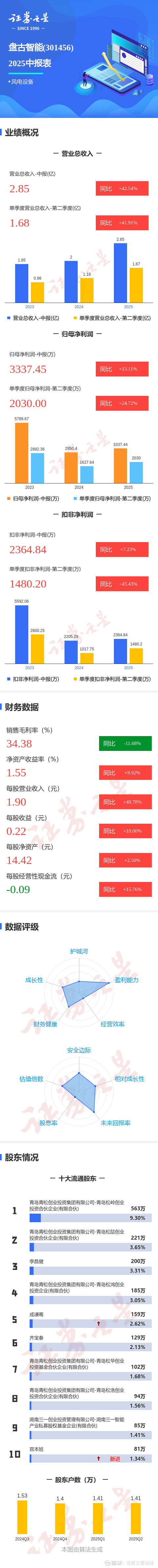 证券之星消息,盘古智能2025年中报显示,公司主营收入2.85亿元,同比上升42.55%;归母净利润3337.45万元,同比上升13.12%;扣非净利润2364.84万元,同比上升7.23%;其中2025年第二季度,公司单季度主营收入1.68亿元,同比上升41.92%;单季度归母净利润2030.0万元,同比上升24.72%;单季度扣非净利润1480.2万元,同比上升45.44%;负债率8.26%,投资收益996.27万元,财务费用-508.95万元,毛利率34.38%。