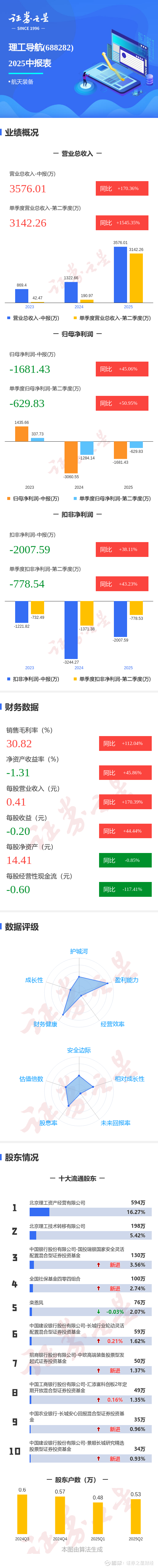 证券之星消息,理工导航2025年中报显示,公司主营收入3576.01万元,同比上升170.36%;归母净利润-1681.43万元,同比上升45.06%;扣非净利润-2007.59万元,同比上升38.12%;其中2025年第二季度,公司单季度主营收入3142.26万元,同比上升1545.36%;单季度归母净利润-629.83万元,同比上升50.95%;单季度扣非净利润-778.54万元,同比上升43.23%;负债率14.73%,投资收益-176.98万元,财务费用-488.98万元,毛利率30.82%。
