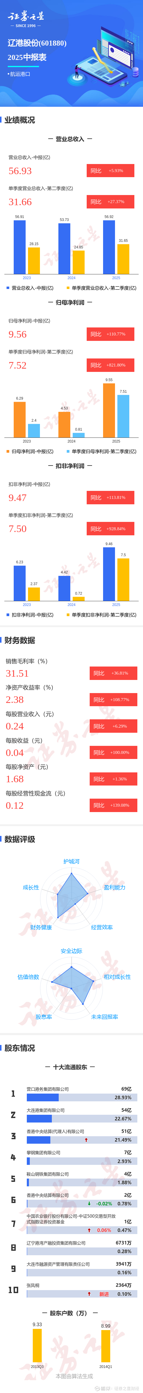 证券之星消息,辽港股份2025年中报显示,公司主营收入56.93亿元,同比上升5.93%;归母净利润9.56亿元,同比上升110.78%;扣非净利润9.47亿元,同比上升113.82%;其中2025年第二季度,公司单季度主营收入31.66亿元,同比上升27.37%;单季度归母净利润7.52亿元,同比上升821.81%;单季度扣非净利润7.5亿元,同比上升928.84%;负债率24.2%,投资收益1.06亿元,财务费用2.09亿元,毛利率31.51%。