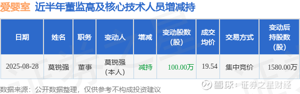 证券之星消息,根据8月28日市场公开信息、上市公司公告及交易所披露数据整理,爱婴室(603214)最新董监高及相关人员股份变动情况:2025年8月28日公司董事莫锐强共减持公司股份100.0万股,占公司总股本为0.7218%。变动期间公司股价下跌1.69%,8月28日当日收盘报19.15元。