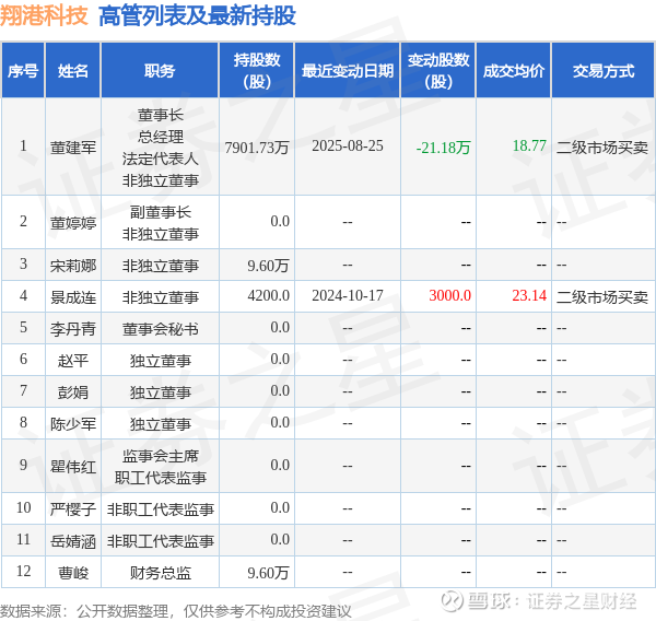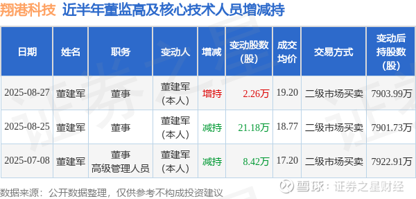 翔港科技近半年内的董监高及核心技术人员增减持详情如下: