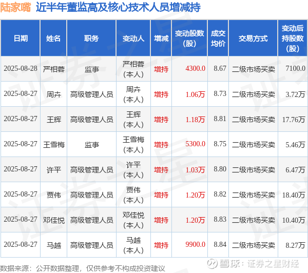 陆家嘴近半年内的董监高及核心技术人员增减持详情如下: