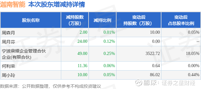 证券之星消息,8月28日迦南智能发布公告《迦南智能:关于公司实际控制人之一致行动人减持计划期限届满的公告》,其股东周森月、周月芬、宁波鼎耀企业管理合伙企业(有限合伙)、何利荣、周小玲于2025年5月28日至2025年8月27日间合计减持96.36万股,占公司目前总股本的0.4937%,变动期间该股股价上涨4.88%,截止8月27日收盘报21.06元。