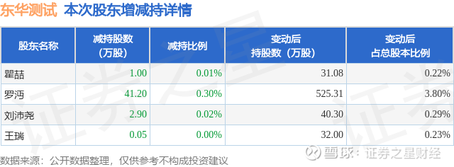 证券之星消息,8月28日东华测试发布公告《东华测试:关于控股股东、实际控制人及其一致行动人减持股份触及1%整数倍暨减持计划实施完成的公告》,其股东瞿喆、罗沔、刘沛尧、王瑞于2025年8月27日至2025年8月28日间合计减持45.15万股,占公司目前总股本的0.3265%,变动期间该股股价下跌0.95%,截止8月28日收盘报45.92元。