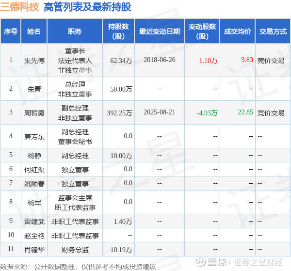 三德科技近半年内的董监高及核心技术人员增减持详情如下: