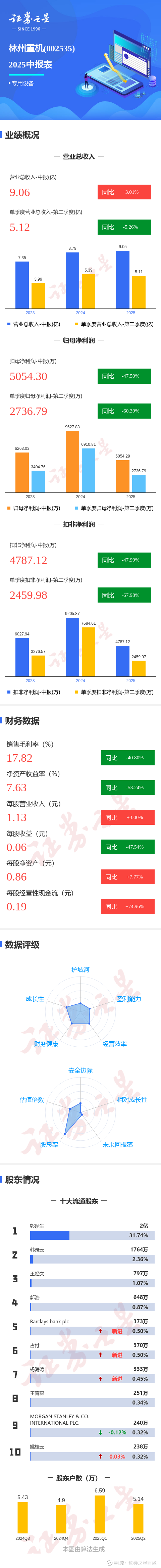 证券之星消息,林州重机2025年中报显示,公司主营收入9.06亿元,同比上升3.02%;归母净利润5054.3万元,同比下降47.5%;扣非净利润4787.12万元,同比下降48.0%;其中2025年第二季度,公司单季度主营收入5.12亿元,同比下降5.26%;单季度归母净利润2736.79万元,同比下降60.4%;单季度扣非净利润2459.98万元,同比下降67.99%;负债率83.32%,投资收益-501.81万元,财务费用5689.91万元,毛利率17.82%。