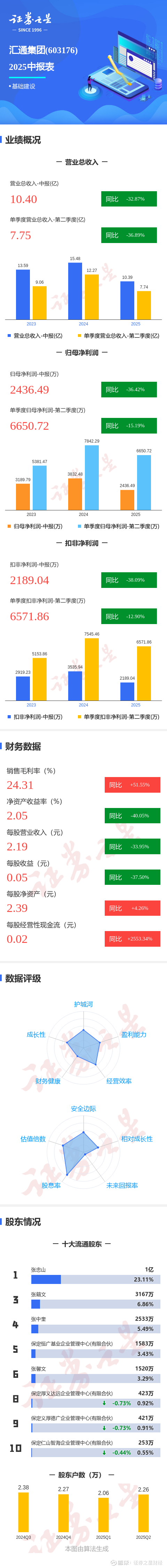 证券之星消息,汇通集团2025年中报显示,公司主营收入10.4亿元,同比下降32.87%;归母净利润2436.49万元,同比下降36.43%;扣非净利润2189.04万元,同比下降38.09%;其中2025年第二季度,公司单季度主营收入7.75亿元,同比下降36.89%;单季度归母净利润6650.72万元,同比下降15.19%;单季度扣非净利润6571.86万元,同比下降12.9%;负债率78.73%,投资收益-2484.57万元,财务费用4592.32万元,毛利率24.31%。