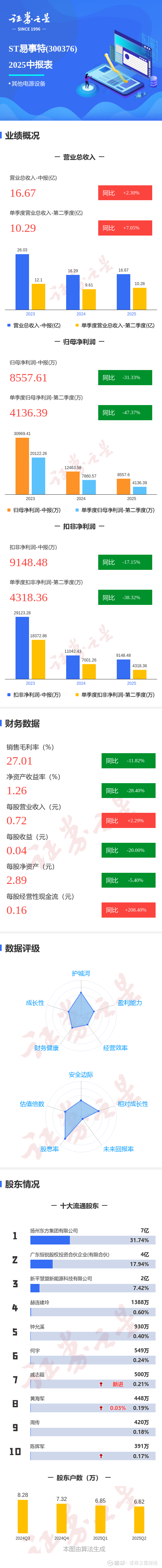 证券之星消息,ST易事特2025年中报显示,公司主营收入16.67亿元,同比上升2.3%;归母净利润8557.61万元,同比下降31.34%;扣非净利润9148.48万元,同比下降17.15%;其中2025年第二季度,公司单季度主营收入10.29亿元,同比上升7.05%;单季度归母净利润4136.39万元,同比下降47.38%;单季度扣非净利润4318.36万元,同比下降38.32%;负债率45.85%,投资收益-59.78万元,财务费用2659.33万元,毛利率27.01%。