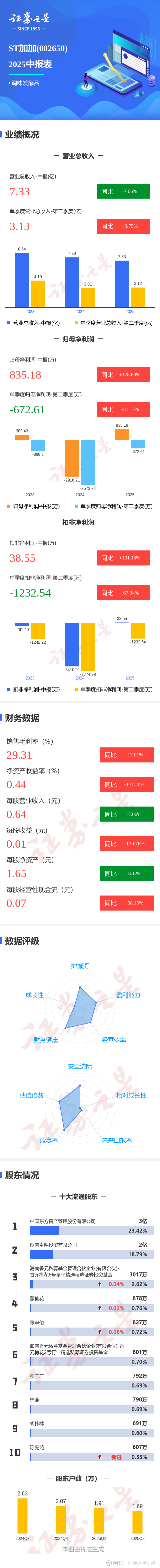 证券之星消息,ST加加2025年中报显示,公司主营收入7.33亿元,同比下降7.07%;归母净利润835.18万元,同比上升128.64%;扣非净利润38.55万元,同比上升101.13%;其中2025年第二季度,公司单季度主营收入3.13亿元,同比上升3.75%;单季度归母净利润-672.61万元,同比上升81.17%;单季度扣非净利润-1232.54万元,同比上升67.35%;负债率15.3%,投资收益118.87万元,财务费用100.72万元,毛利率29.31%。